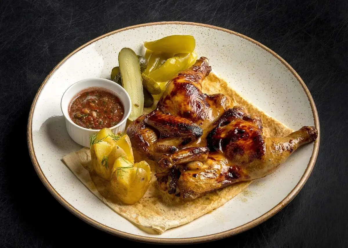 Цыпленок, картофель бейби, аджика, соус тар-тар, зелень