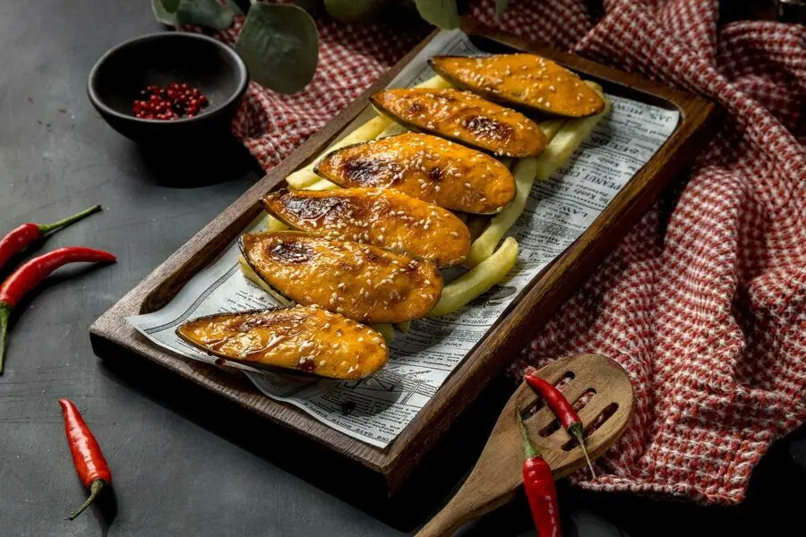Мидии КИВИ, соус том-ям, соус унаги, картофель фри, паприка, кунжут
