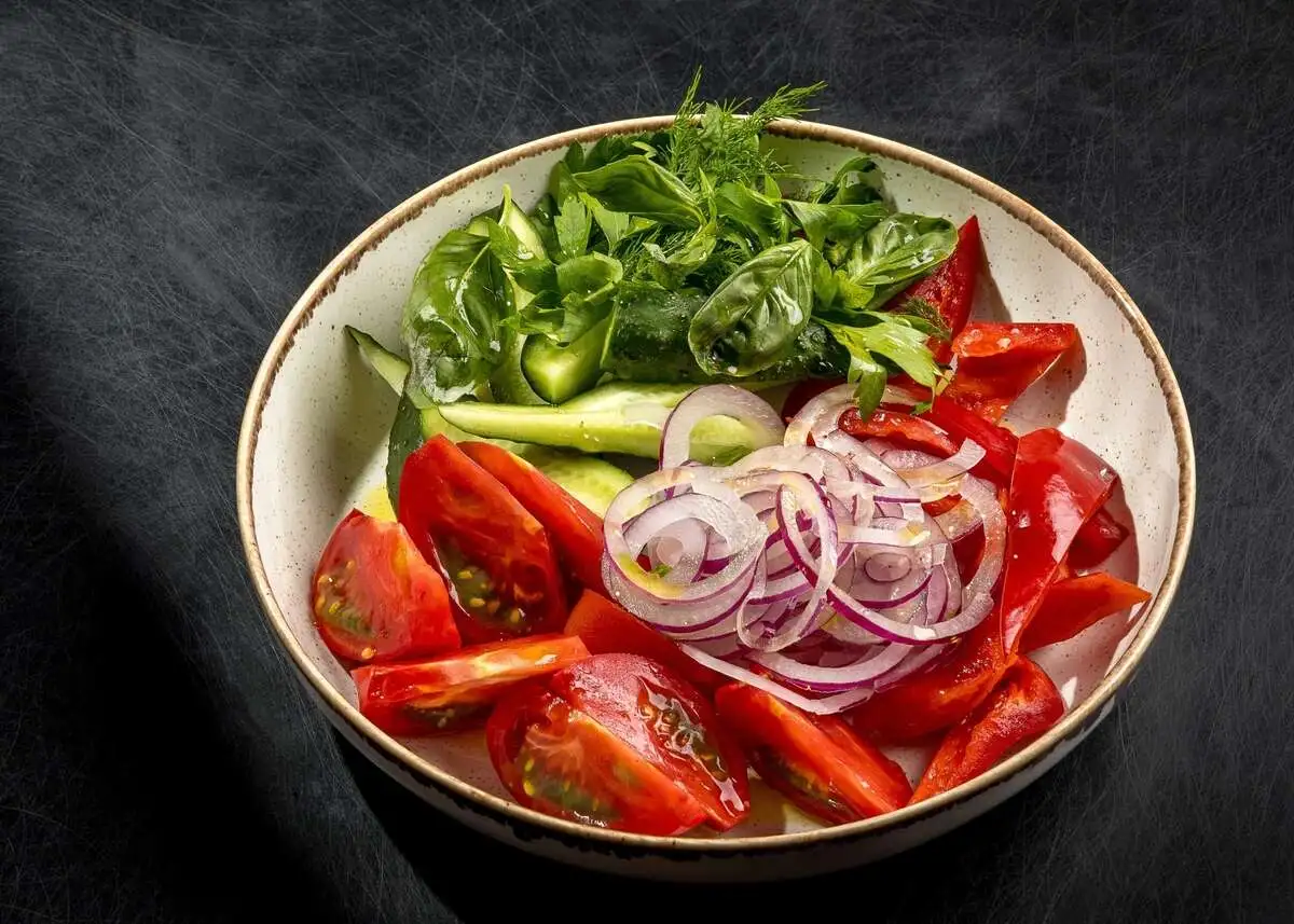 Азербайджанские помидоры, болгарский перец, фермерские огурцы, зелень, красный лук